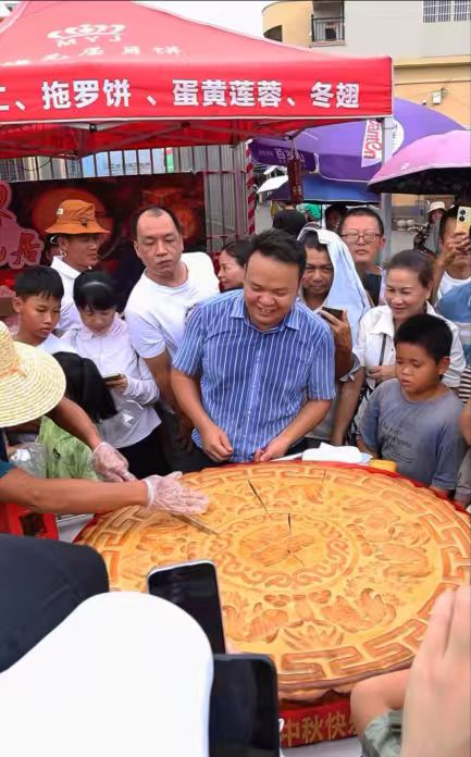 活动现场,直径约120厘米、厚度15厘米、重达300市斤的巨型月饼格外吸睛。梅元居饼业有限公司庞博元董事长亲自带领15人团队到场,与杨太利一同协助完成月饼分割。据庞总介绍,这款月饼的制作暗藏巧思:由56人共同制作,象征“56个民族团结一心”;选用365个黄蛋仁,搭配一代伟人家乡的莲子为原料,寓意“365天红心向党”,每一处细节都凝聚着对家国情怀的表达。